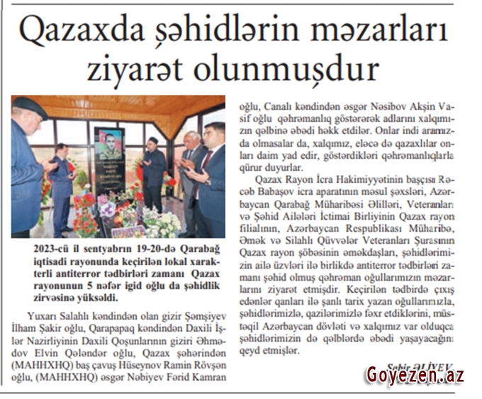 Respublika mətbuatı Qazax haqqında 2023-cü il sentyabrın 19-20-də Qarabağ iqtisadi rayonunda keçirilən lokal xarakterli antiterror tədbirləri zamanı Qazax rayonunun 5 nəfər igid oğlu da şəhidlik zirvəsinə yüksəldi. Yuxarı Salahlı kəndindən olan gizir Şəmşiyev İlham Şakir oğlu, Qarapapaq kəndindən Daxili İşlər Nazirliyinin Daxili Qoşunlarının giziri Əhmədov Elvin Qələndər oğlu, Qazax şəhərindən (MAHHXHQ) baş çavuş Hüseynov Ramin Rövşən oğlu, (MAHHXHQ) əsgər Nəbiyev Fərid Kamran oğlu, Canalı kəndindən əsgər Nəsibov Akşin Vasif oğlu qəhrəmanlıq göstərərək adlarını xalqımızın qəlbinə əbədi həkk etdilər. Onlar indi aramızda olmasalar da, xalqımız, eləcə də qazaxlılar onları daim yad edir, göstərdikləri qəhrəmanlıqlarla qürur duyurlar. Qazax Rayon İcra Hakimiyyətinin başçısı Rəcəb Babaşov icra aparatının məsul şəxsləri, Azərbaycan Qarabağ Müharibəsi Əlilləri, Veteranları və Şəhid Ailələri İctimai Birliyinin Qazax rayon filialının, Azərbaycan Respublikası Müharibə, Əmək və Silahlı Qüvvələr Veteranları Şurasının Qazax rayon şöbəsinin əməkdaşları, şəhidlərimizin ailə üzvləri ilə birlikdə antiterror tədbirləri zamanı şəhid olmuş qəhrəman oğullarımızın məzarlarını ziyarət etmişdir. Keçirilən tədbirdə çıxış edənlər qanları ilə şanlı tarix yazan oğullarımızla, şəhidlərimizlə, qazilərimizlə fəxr etdiklərini, müstəqil Azərbaycan dövləti və xalqımız var olduqca şəhidlərimizin də qəlblərdə əbədi yaşayacağını qeyd etmişlər. Sabir ƏLİYEV, "Azərbaycan" qəzetinin bölgə müxbiri 21 sentyabr 2025-ci il